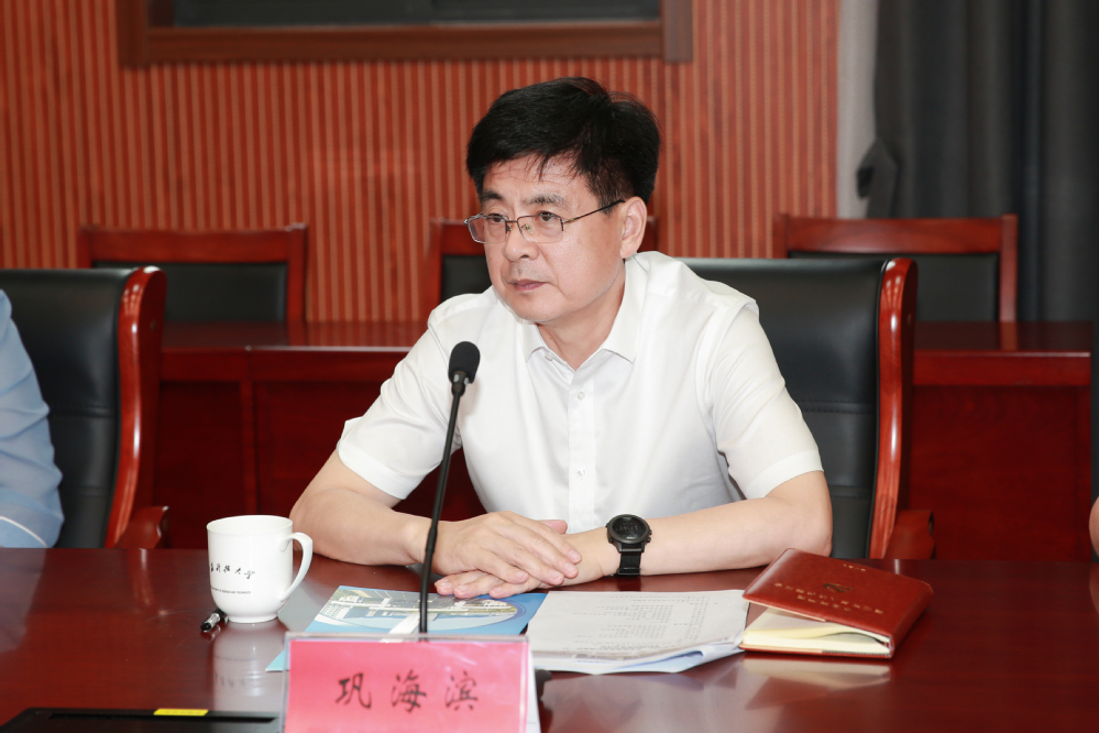 巩海滨对学校的热情接待表示感谢,对学校近年来取得的成绩表示高度肯定,对学校师生的良好精神面貌、深厚的爱国爱事业情怀表示赞赏。巩海滨指出,大学的发展与地方的发展密不可分,江科大办学特色明显、学科专业设置全、科技创新能力强,紧盯国家和行业发展需求,助力打造“大国重器”,为地方和行业输送了大批优秀人才,希望江科大继续充分发挥行业优势和科教资源,不断深化校地融合,在奋力“奔跑”中铸就高水平大学。巩海滨还就学校党建工作、学生思想政治教育工作、意识形态工作、统战工作提出了意见建议。