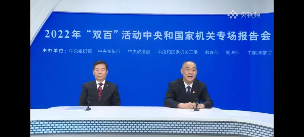 7月22日,2022年“百名法学家百场报告会”法治宣讲活动中央和国家机关专场报告会以网络直播形式举办。我校组织党员干部、教师、学生等通过“央视频”APP收看了专场报告会直播。据悉,今年“双百”活动的主题为“深入学习宣传贯彻习近平法治思想”。