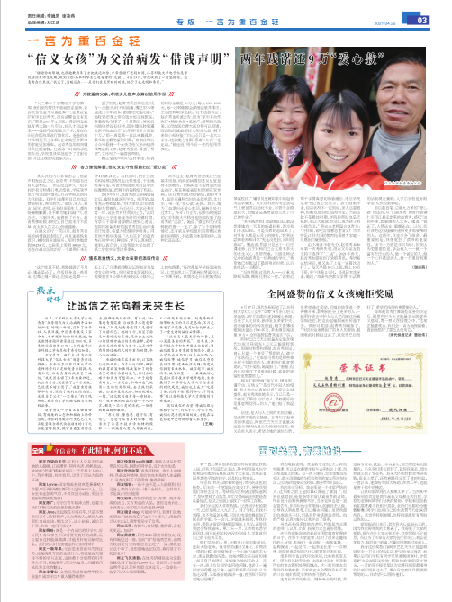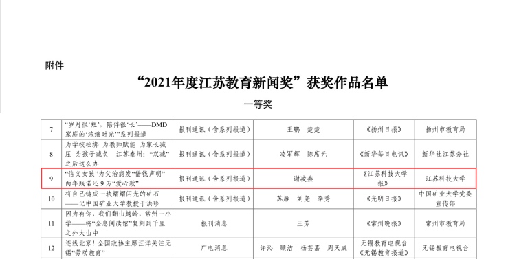 “2021年度江苏教育新闻奖”评选日前揭晓,由《 报》原文刊登并推荐报送的作品《“信义女孩”为父治病发“借钱声明”两年践诺还9万“爱心款”》(作者:谢凌燕,原载于2021年4月25日《 报》第802期)获得一等奖,这是学校校报作品首次获得“江苏教育新闻奖”一等奖,也是全省高校校报唯一的一件一等奖作品。