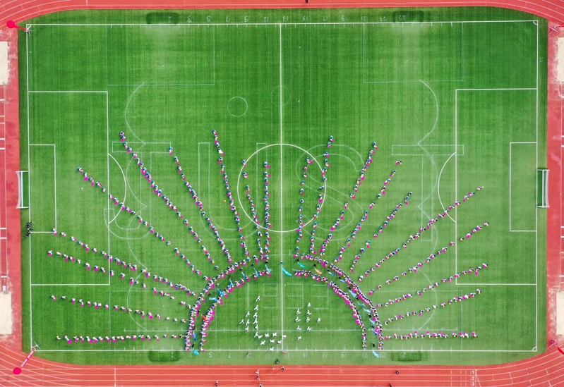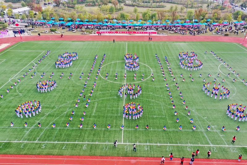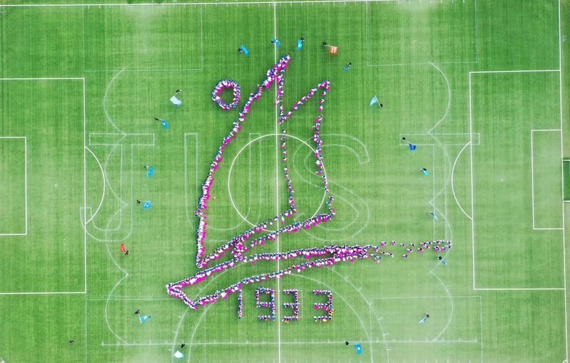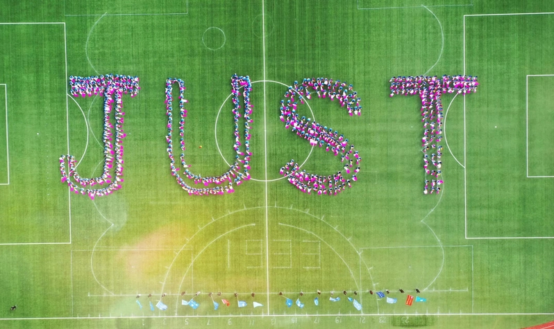 团体操表演以“庆贺党的二十大,传承冬奥精神”为主题,凝聚了主创教师团队及500余名学生的近2个月辛勤付出,青春洋溢、场面震撼。篇章一“奋进新时代,一起向未来”,绿茵场上,两个米字轮轴不停转动,象征着晶莹雪花与生命花束美丽绽放,契合了北京冬奥会“一起向未来”的主题口号;篇章二“青春舞飞扬,全民共健康”,同学们手中彩扇随风飘扬,灵活的舞姿书写运动青春,为全民健康贡献力量;篇章三“共筑船魂梦,强国必有我”,金色的太阳散发出一道道光芒,他们用飞扬的青春礼赞美好生活, “J”“U”“S”“T”和 校徽相继展现,鲜艳的长扇和彩旗不断舞动,表达了对学校航向未来和党的二十大胜利召开最真诚的献礼和祝福。