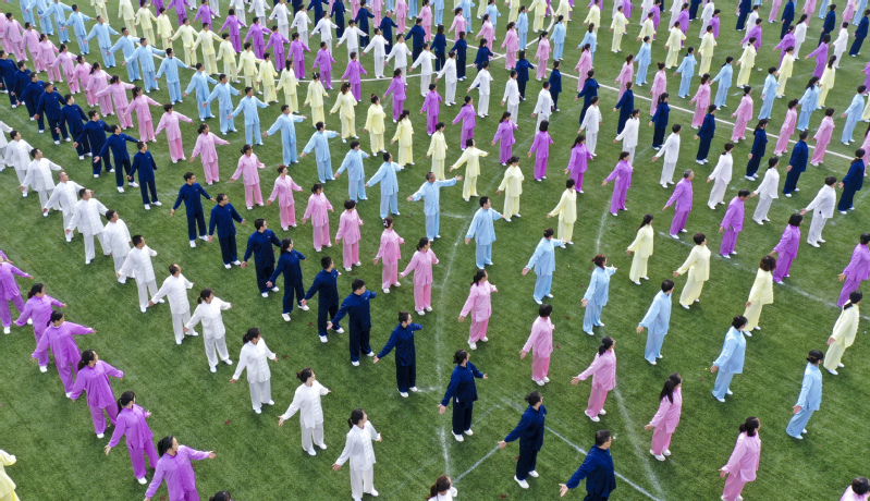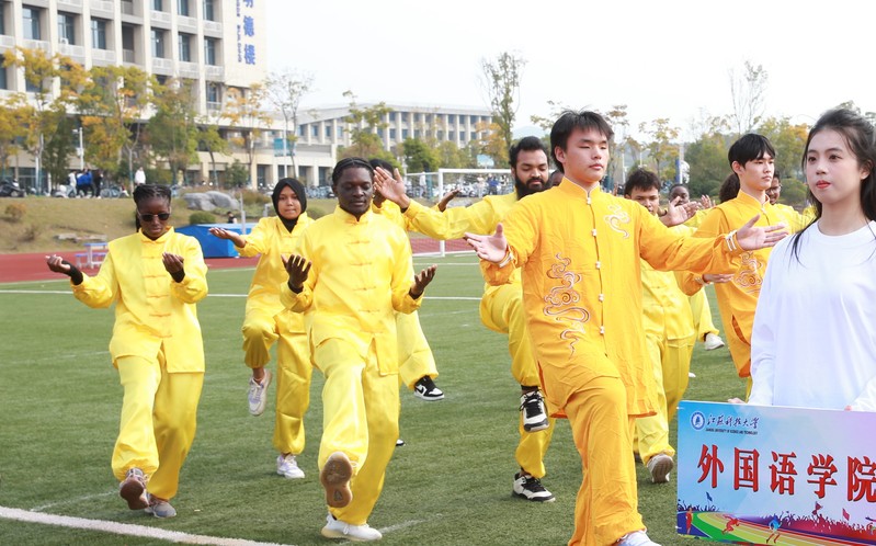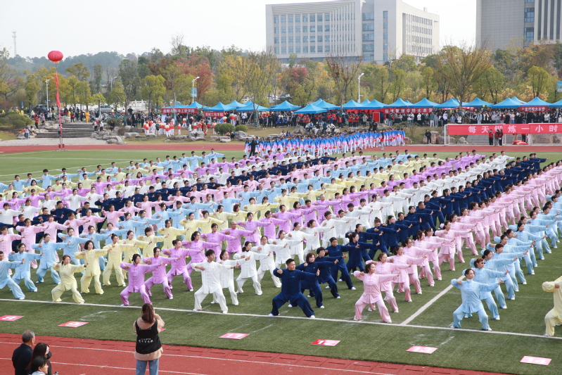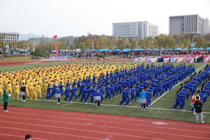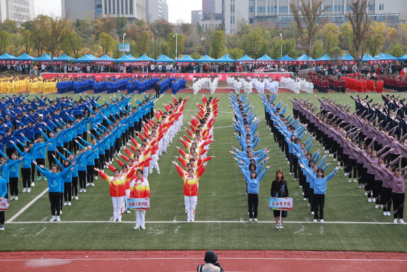伴着热烈的掌声与欢呼声,精彩的体育表演开始。各学院整齐划一地展示广播操和太极拳训练成果,一招一式无不彰显 “一操、一拳、一泳”的公共体育教学特色。“乐运动、全民享、共筑科大梦”,由我校800余名教职工组成的团队为大家奉献了精彩的八段锦表演,运动员们气定神闲地舒展肢体,动作舒缓、流畅,传达了快乐工作、幸福生活的理念。