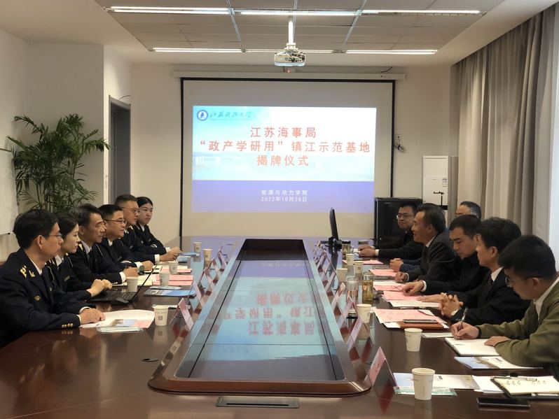 10月28日,江苏海事局与我校举行首家海事履约研究“政产学研用”镇江示范基地揭牌仪式。 党委副书记、副校长景旭文,江苏海事局法规规范处处长费中强、调研员周羽,镇江海事局政委周卫东、执法督察处处长陈兴、党工部主任王飞、执法督察处主办范亚晶,学校对外合作处处长王荣、科技处副处长张建、能动学院领导班子成员及相关人员参加揭牌仪式并座谈交流。能动学院党委书记温华兵主持。