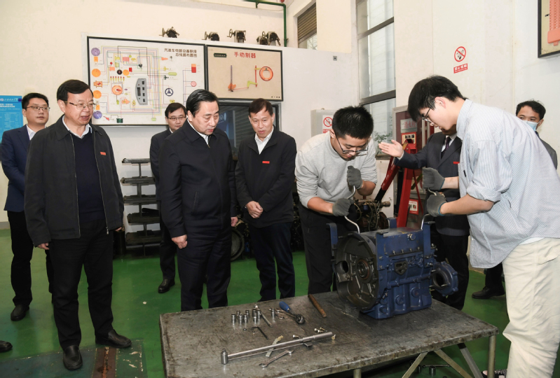 马明龙书记一行首先来到能源与动力学院重装实验楼,参观了船舱综合实训实验室、柴油机拆装实训室、发动机性能测试实验室、轮机综合机舱实验室和振动噪声实验室,观看了氢能源船舶演示、舰船风机盘管实验、消声减震实验等项目,对我校积极承担和参与国家重大科研项目的研发,在突破“卡脖子”技术问题等方面所作的努力予以肯定。马书记与在场师生开展互动交流,勉励学生为中国式现代化贡献青春力量。