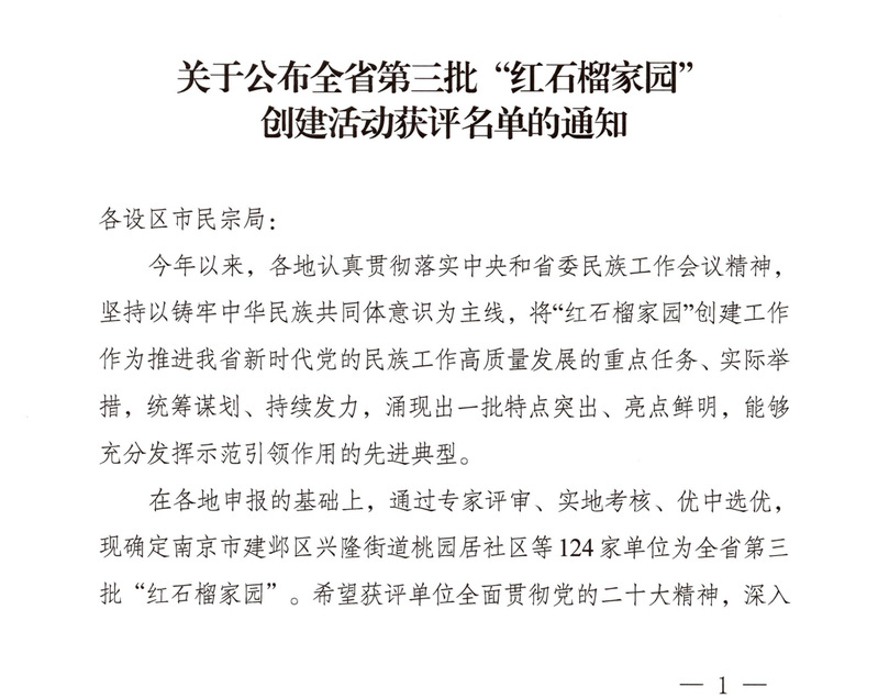 日前,江苏省民族宗教事务委员会公布江苏省“红石榴家园”创建活动获评名单,我校红石榴工作室获此殊荣。为认真贯彻落实中央民族工作会议精神,切实把铸牢中华民族共同体意识作为党的民族工作主线推进,江苏省民族宗教事务委员会持续开展红石榴家园创建活动。在各地申报的基础上,经过专家评审、实地考核、优中选优,共124家单位入选本批次“红石榴家园”,其中6所高校入选。