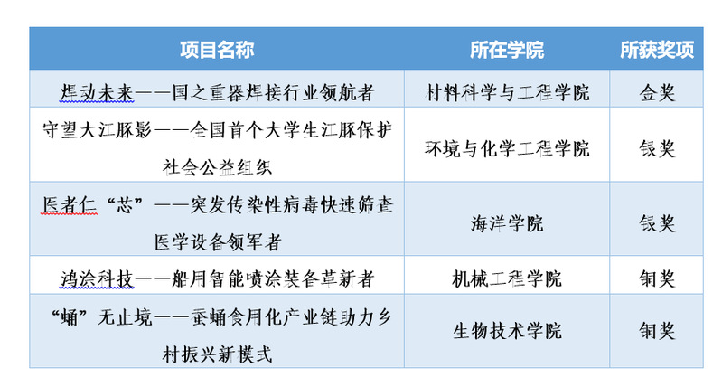 经过全国终审决赛的激烈角逐,我校材料科学与工程学院《焊动未来——国之重器焊接行业领航者》摘得金奖;环境与化学工程学院《守望大江豚影——全国首个大学生江豚保护社会公益组织》和海洋学院《医者仁“芯”——突发传染性病毒快速筛查医学设备领军者》摘得银奖。此外,机械工程学院《鸿涂科技——船用智能喷涂装备革新者》和生物技术学院《“蛹”无止境——蚕蛹食用化产业链助力乡村振兴新模式》摘得铜奖。