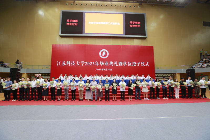 一朝沐杏雨,一生念师恩。在江科大学习生活期间,有很多人悉心指导与贴心陪伴,为同学们提供无微不至的服务与关怀,他们也为毕业生送上朴实而又饱含真情的祝福。毕业生代表向学校教育教学一线的教师、辅导员、班主任,管理、后勤等服务保障部门的教职员工代表献花,感谢全体教职员工的辛勤付出,“你们辛苦了!”