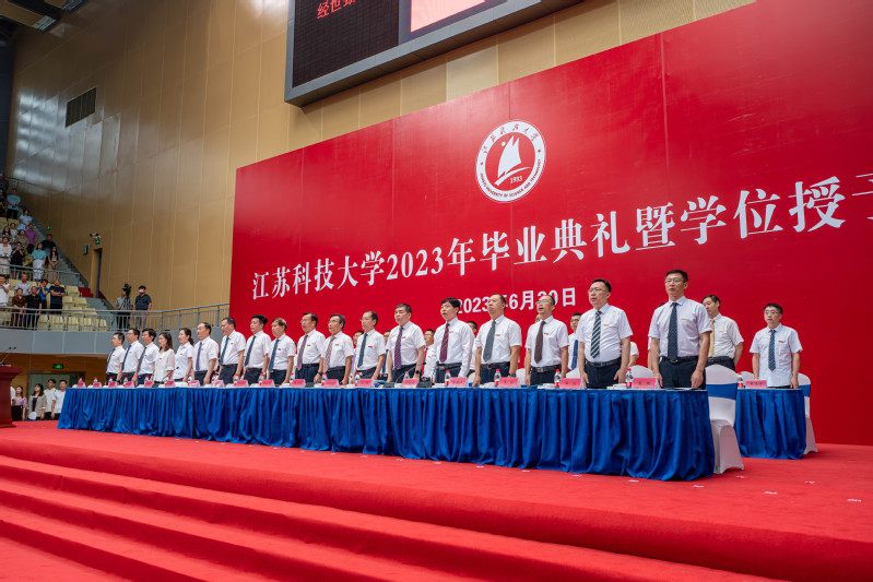 8点30分,在激昂雄壮的国歌声中, 2023年毕业典礼暨学位授予仪式大幕开启。毕业典礼主会场设于镇江市高校园区共享体育馆,张家港校区设置视频分会场。典礼全程通过江科大官方微信视频号、抖音、微博、哔哩哔哩等网络平台直播,全网在线观看累计16万余人次。