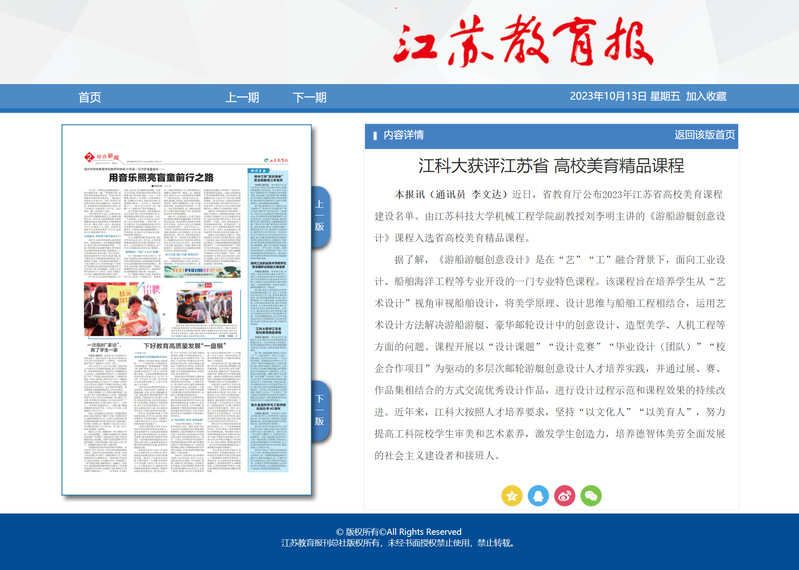 本报讯(通讯员 李文达)近日,省教育厅公布2023年江苏省高校美育课程建设名单。由 机械工程学院副教授刘李明主讲的《游船游艇创意设计》课程入选省高校美育精品课程。