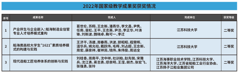 7月24日,教育部公布《教育部关于批准2022年国家级教学成果奖获奖项目的决定》(教师〔2023〕4号)。 《产业伴生与企业嵌入:船海制造业信管专业人才培养模式重构》《船海类高校大学生“1621”素质培养模式的构建与实践》等2项成果喜获高等教育(本科)国家级教学成果奖二等奖,学校作为第二完成单位参与的成果《现代造船工匠培养体系的创新与实践》喜获职业教育国家级教学成果奖二等奖。实现学校国家级教学成果奖历史性突破。国家级教学成果奖每四年评选一次,此次获奖是学校高质量发展和高水平大学建设的重大标志性成果。学校将以此次获奖为契机,激励广大教师投身教学研究与实践,进一步深化教育教学综合改革,推动高质量发展,实现高水平大学建设目标。