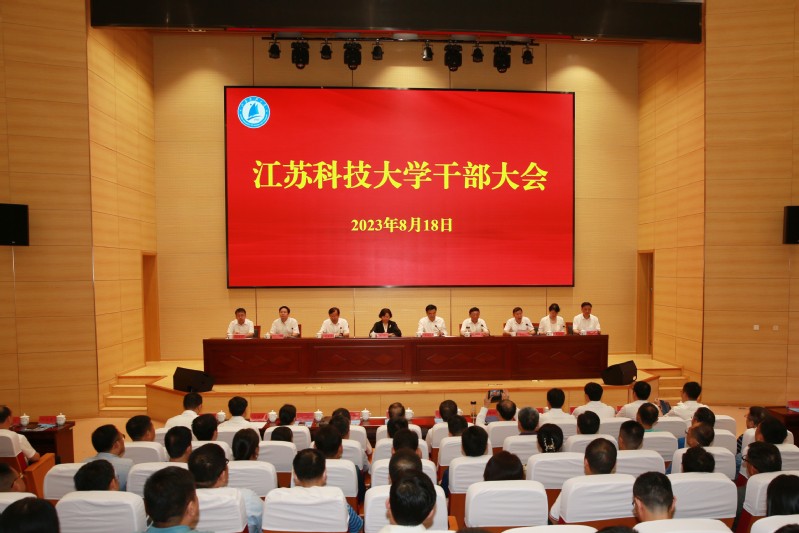 8月18日上午, 召开全校干部大会,宣布省委关于校领导班子调整的决定。省委组织部副部长季振华,省委教育工委副书记潘漫出席会议并讲话。新一届校领导班子致力带领全校上下担当实干、稳中求进,坚定走好高质量发展之路,为中国式现代化江苏新实践贡献江科大力量。校党委书记周南平作表态发言,指出将深入学习习近平新时代中国特色社会主义思想,坚定正确的办学方向;履职尽责、科学谋划,推动高水平大学建设与发展;勤政廉政,打造风清气正、务实肯干的办学氛围,在服务国家重大战略需求和江苏省“走在前、做示范”光荣使命中奋力作为。校长嵇春艳作表态发言,指出将矢志不渝保持特色发展、接续奋斗深耕内涵建设,努力以高水平科技成果、高水平产教融合、高水平文化传承创新、高水平大学治理,为在推进中国式现代化中走在前做示范作出应有贡献。