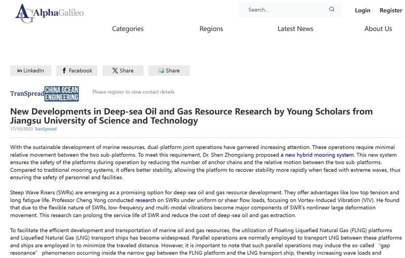 在 庆祝办学90周年之际,学校在深海油气资源开发研究中取得新进展,迎来又一波海内外广泛关注。中国第一本海洋工程领域SCI期刊China Ocean Engineering(中国海洋工程)发表 深海油气资源开发研究新进展的学术新闻(受中国科协卓越计划资助),介绍了该校程勇教授、高俊亮教授等青年学者,在深海复杂环境条件下油气生产、运输设备的设计和操作性能方面的研究进展。报道发布后受到广泛关注,被优睿科、美联社等多家媒体转发。