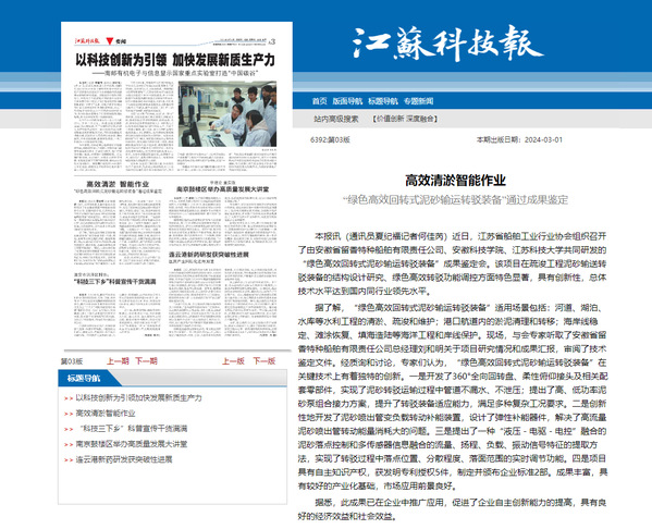 据了解,“绿色高效回转式泥砂输运转驳装备”适用场景包括:河道、湖泊、水库等水利工程的清淤、疏浚和维护;港口航道内的淤泥清理和转移;海岸线稳定、滩涂恢复、填海造陆等海洋工程和岸线保护。现场,与会专家听取了安徽省留香特种船舶有限责任公司总经理刘和明关于项目研究情况和成果汇报,审阅了技术鉴定文件。经质询和讨论,专家们认为,“绿色高效回转式泥砂输运转驳装备”在关键技术上有着独特的创新。一是开发了360°全向回转盘、柔性俯仰接头及相关配套零部件,实现了泥砂转驳运输过程中管道不漏水、不泄压;提出了高、低功率泥砂泵组合接力方案,提升了转驳装备适应能力,满足多种复杂工况要求。二是创新性地开发了泥砂喷出管变负载转动补能装置,设计了弹性补能器件,解决了高流量泥砂喷出管转动能量消耗大的问题。三是提出了一种“液压-电驱-电控”融合的泥砂落点控制和多传感器信息融合的流量、扬程、负载、振动信号特征的提取方法,实现了转驳过程中落点位置、分散程度、落面范围的实时调节功能。四是项目具有自主知识产权,获发明专利授权5件,制定并颁布企业标准2部。成果丰富,具有较好的产业化基础,市场应用前景良好。