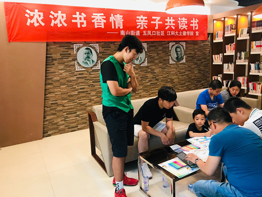 7月5日,土建学院“培风图南”实践团队暑期社会实践暨“礼赞新中国,奏响新南山”南山街道第二届文体艺术节第二站“浓浓书香情,亲子共读书”活动在南山街道五凤口社区图书馆举办。