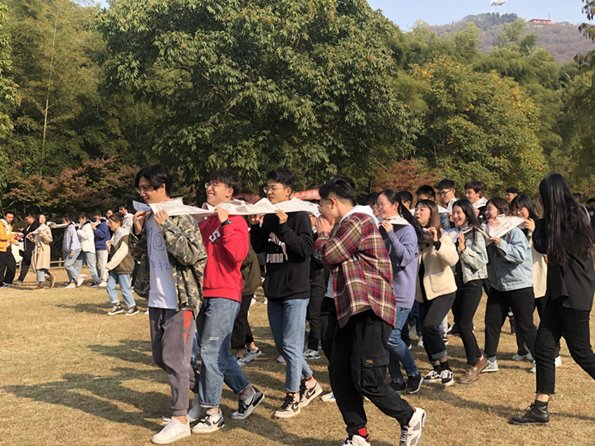 活动开始前,由主持人将队员们随机分组,各组自行设计组名、口号。精彩的活动正式开始,在抢车位、勇过雷区、蚕虫行和爱的魔力转圈圈等一个个竞赛环节中都能体现出同学们之间的团结、协作与信任,在欢声笑语中,同学们结识了许多新朋友,表现出色的同学更是赢得了大家的呐喊与关注。场边没有参赛的同学也在不断地加油助威,活跃且热烈,仿佛自己就是在场上比赛的同学一样。活动最后,大家围坐一圈欣赏多才多艺的同学带来的精彩表演,他们动听的歌声和优美的舞姿更是引来了在南山景区游玩的镇江市民的围观。