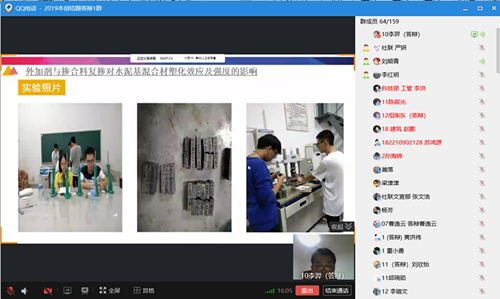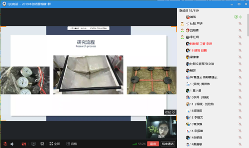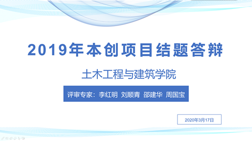 在疫情防控特殊时期,3月17日晚,土建学院采取全新的答辩形式——线上开展2019年本创计划结题答辩,特邀土建学院党委副书记、关工委副主任李红明,青年骨干教师邵建华、刘顺青和周国宝担任评委。