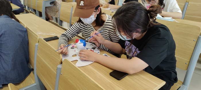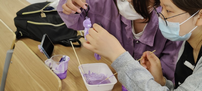 随着材料发放完毕,同学们的笔尖与手指一起纷飞。不同颜色的碰撞激荡出千姿万态的水花,倾注而下的流体画装点钥匙扣,是成品,更是满满的青春。笔底春秋,洋洋洒洒,或挥毫,或小心翼翼,石膏娃娃染上了色彩,是同学们的点睛之笔,也是每一个独一无二的自我。以糖为墨,以勺为笔,恣意起舞,糖里画出的是传统文化的魅力,是同学们少年时期的回忆。手指翩飞,一搓,一揉,一压,一塑,他们正在贴近自然的味道,软而无形的陶泥于巧手中变得憨态可掬,变得搞笑古怪,是陶泥的可塑性,更是每一位创作者无限的未来。