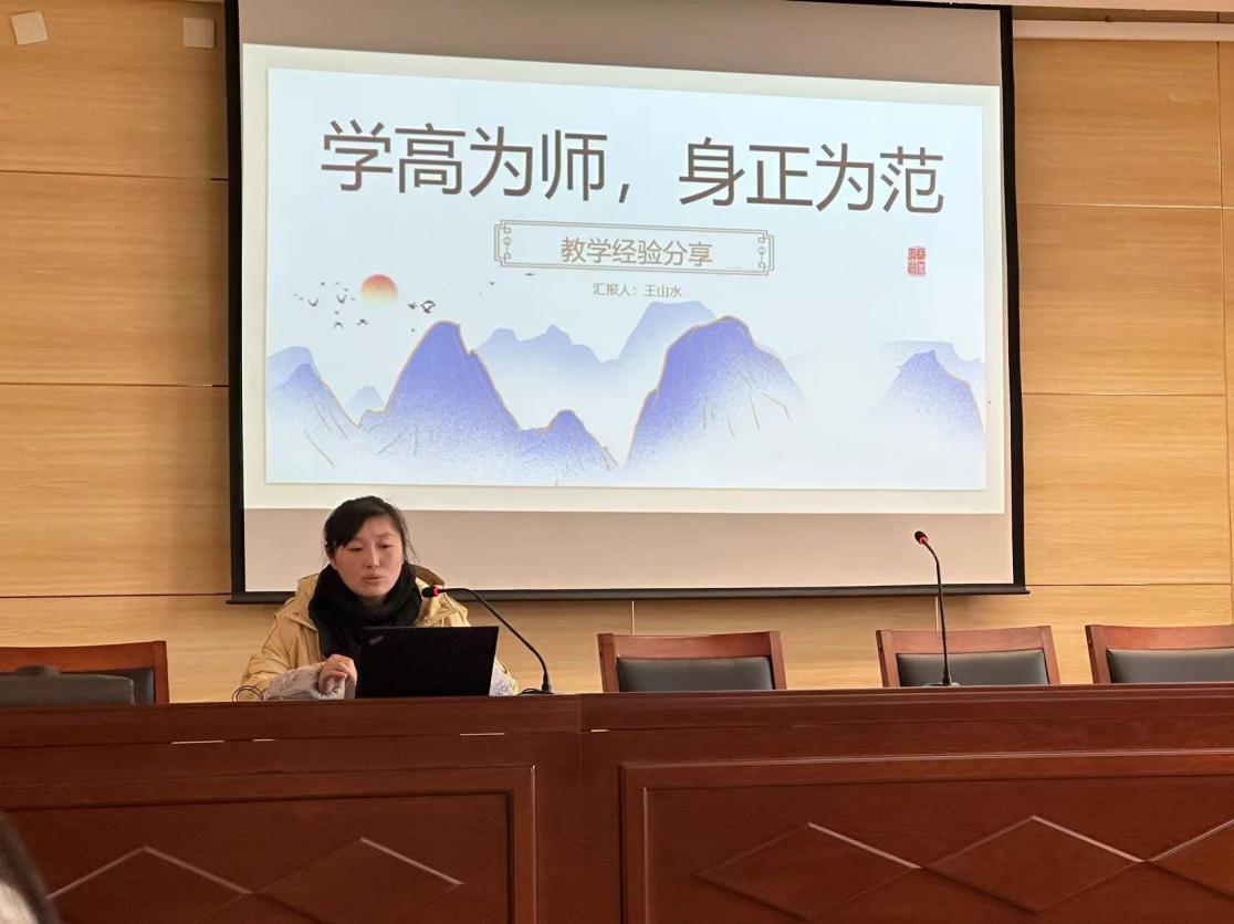 随后,进入本次活动第二部分,由教学评优获得者王山水老师进行题为“学高为师,身正为范”的主题讲座(见图3)。王老师认为,“做一名好老师”是许多老师一生所追求的目标,也是她的目标。她以“师德”规范自己的教育教学工作,以“当一名好老师”作为自己工作的座右铭。此次活动,王老师从每位“好老师”都要关注的教育教学方面、教学资料整理以及教学评分细节等方面来分享她的教学心得,参会教师受益匪浅。