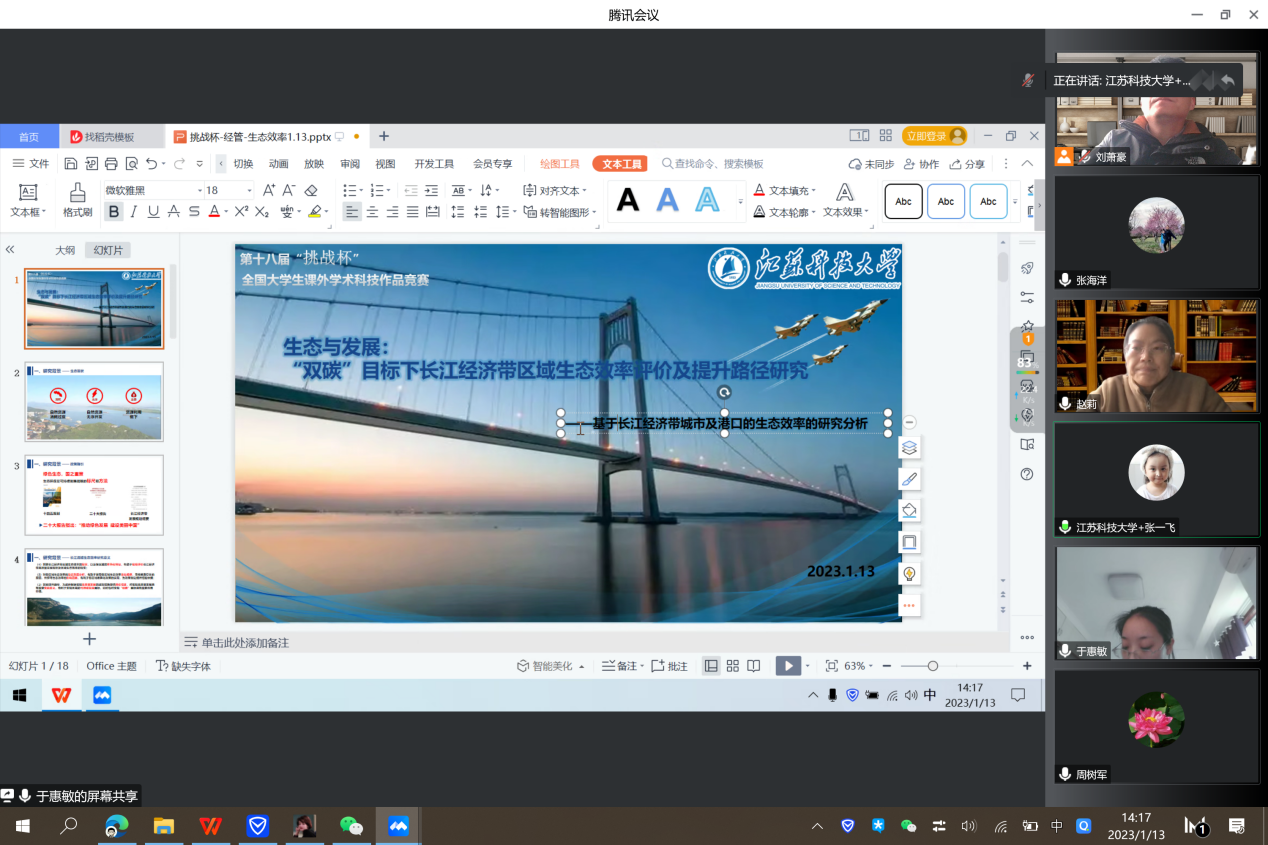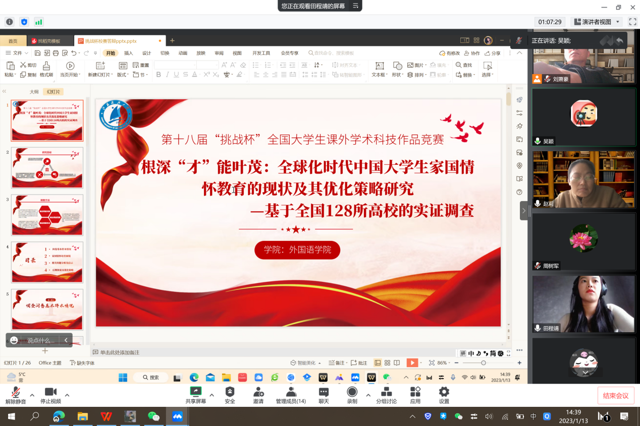 为进一步做好“挑战杯”项目培育工作,1月13日下午,外国语学院以线上会议形式组织了“挑战杯”项目答辩指导会,邀请校团委书记张海洋、校团委副书记张一飞、外国语学院副院长韩菁菁、大外三部主任吴颖参与指导交流。外国语学院党委书记姚双良、副院长周树军、团委副书记刘萧豪、项目指导老师和团队成员参会,会议由学院党委副书记赵莉主持。