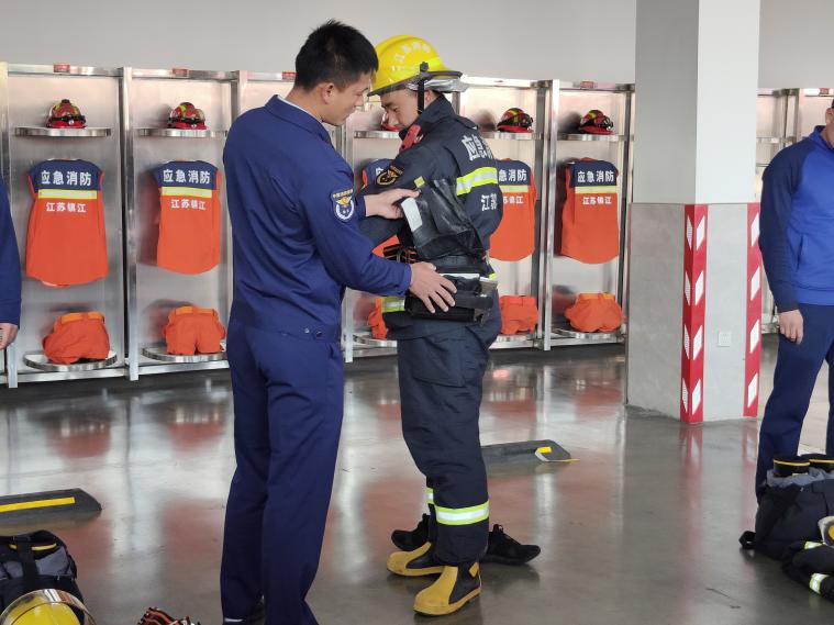 镇江市消防救援支队南徐大道特勤站内,消防员向同学们生动讲解了常用灭火器材的使用方法及维护技巧、日常生活中各类火灾的预防及逃生方法等知识。随后参观了各类型号的消防车,第一次近距离接触消防车的同学们都被其展现出的威武气势折服。在体验战斗服、拼装消防水管的过程中,亲身体验的几位同学深深感受到了战斗服的沉重,无不感慨着要在听到警铃的一分钟内穿着好重达八十斤的战斗服到达消防车前并完成消防作业的消防员们有多么的辛苦。参加活动的姜唯同学感慨道“保障人民健康幸福、人身财产安全的路并非一帆风顺,是消防战士们在替我们负重前行。”
