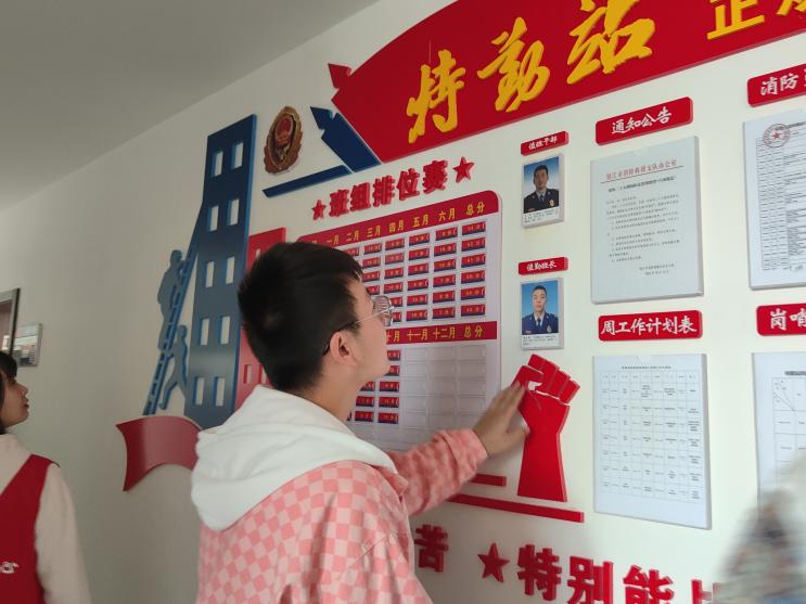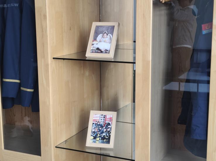在消防战士的生活区内,整齐的被子、硬板的床单、墙上列满的荣誉以及一张张放在橱窗里与战友与家人的合照,将消防战士的铁血柔情展现得淋漓尽致,也深深地刻进了同学们的脑海中。