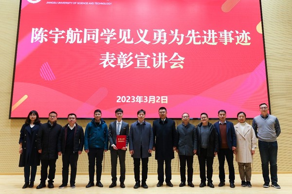 2022年12月,材料科学与工程学院2021级研究生陈宇航夜跑经过常州市钟楼区五星大桥,突然发现运河中有一名女子在拼命挣扎,且身体开始缓缓下沉。陈宇航在报警后,跳入冰冷的河水中先行展开营救,在闻讯赶来的消防员和派出所民警的帮助下,成功将落水女子营救上岸并转送到医院。陈宇航见义勇为的事迹引起社会强烈反响,人民日报、央视新闻、江苏新闻等多家媒体对陈宇航事迹展开报道。