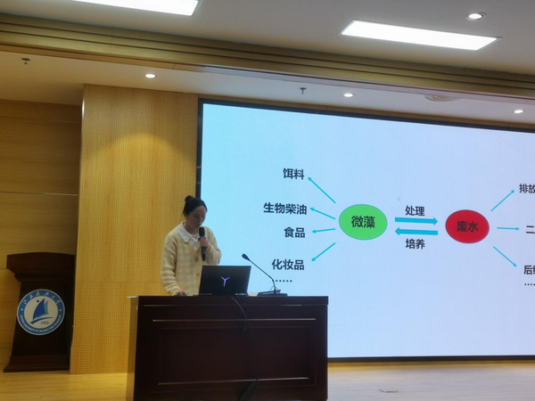杨梦婷同学则分享了微藻培养装置在煮茧废水中培养小球藻的研究成果,她从微藻的概念开始讲述,再将净化煮茧废水,又可以获得生物质这一研究目的娓娓道来。最后得到富含蛋白质、碳水化合物、脂质和色素的生物质逻辑,让同样致力于相关研究的同学们受到了很大的启发与思考。