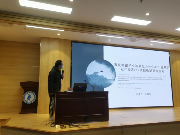 最后,王润芃同学向大家细致地介绍了家蚕微孢子虫被膜复合体COPII 亚基的互作及 Sarl 调控机制研究作用,用图片形式直观表达RNA干扰NbTMP1对家蚕微孢子虫增殖的影响,使大家受益匪浅。