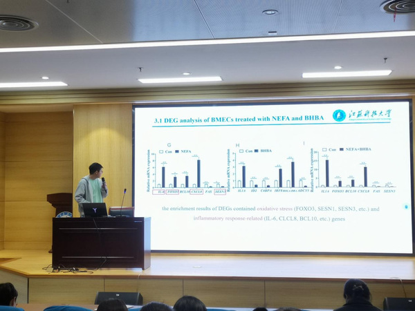 论坛上,黄军鹏同学围绕自己的研究主题:转录组分析建立游离脂肪酸和β-羟丁酸诱导牛乳腺上皮细胞的氧化应激和炎症反应模型进行了学术分享,从奶牛围产期的背景到具体试验选用的抗氧化指标检测、炎症指标检测绘制成了清晰的思维导图,并进行了详细解说。