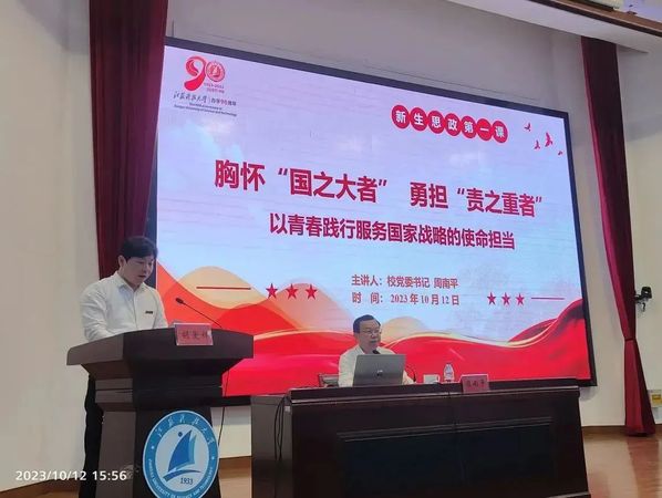 10月12日下午,校党委书记周南平以《胸怀“国之大者”勇担“责之重者”以青春践行服务国家战略的使命担当》为主题向学校全体2023级新生授课,这次授课既是2023级本科生新生转型教育中的重要一课,也是研究生新生和本科生新生同上的思政第一课。课程由校党委常委、副校长胡爱祥主持。300余名本科和研究生代表在梦溪校区演讲厅主课堂听讲,其余学生和相关辅导员在梦溪、长山分课堂同步学习。