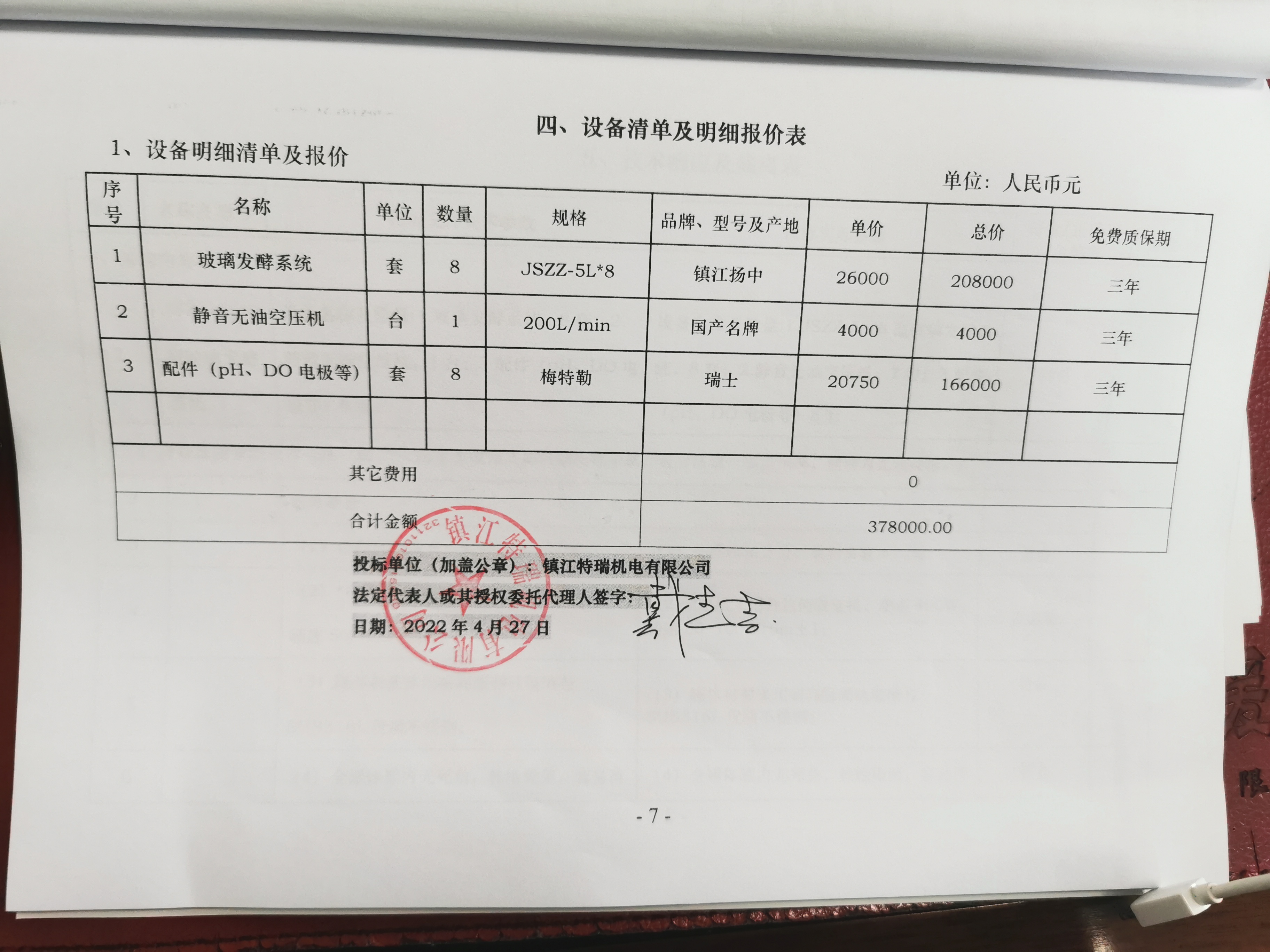 一、项目编号:wz-2022014 二、项目名称:一组玻璃发酵罐(原项目名称:一组GRJB -5D玻璃发酵罐) 三、中标信息 供应商名称:镇江特瑞机电有限公司 供应商地址:镇江市京口区中山东路301号苏宁广场2幢5216室 中标金额:人民币叁拾柒万捌仟元整(¥378000.00) 四、主要标的信息:见附件产品报价清单 五、评审专家名单:杭白红 石凤健 宫璐婵 张亚梅 曹福 六、公告期限 自本公告发布之日起1个工作日。 七、其他补充事宜 各有关当事人对采购结果有异议的,可以在应知其权益受到侵害之日起七个工作日内,以书面形式向 招标办提出质疑,逾期将不再受理。 八、凡对本次公告内容提出询问,请按以下方式联系: 1.采购人信息 名 称: 地址:江苏省镇江市梦溪路2号 联系方式:0511-84432622、84400336 2.项目联系方式 项目联系人:招标办赵老师 电 话:0511-84432622、84400336 传真:0511-84432622 九、附件 1、采购文件 2、产品报价清单