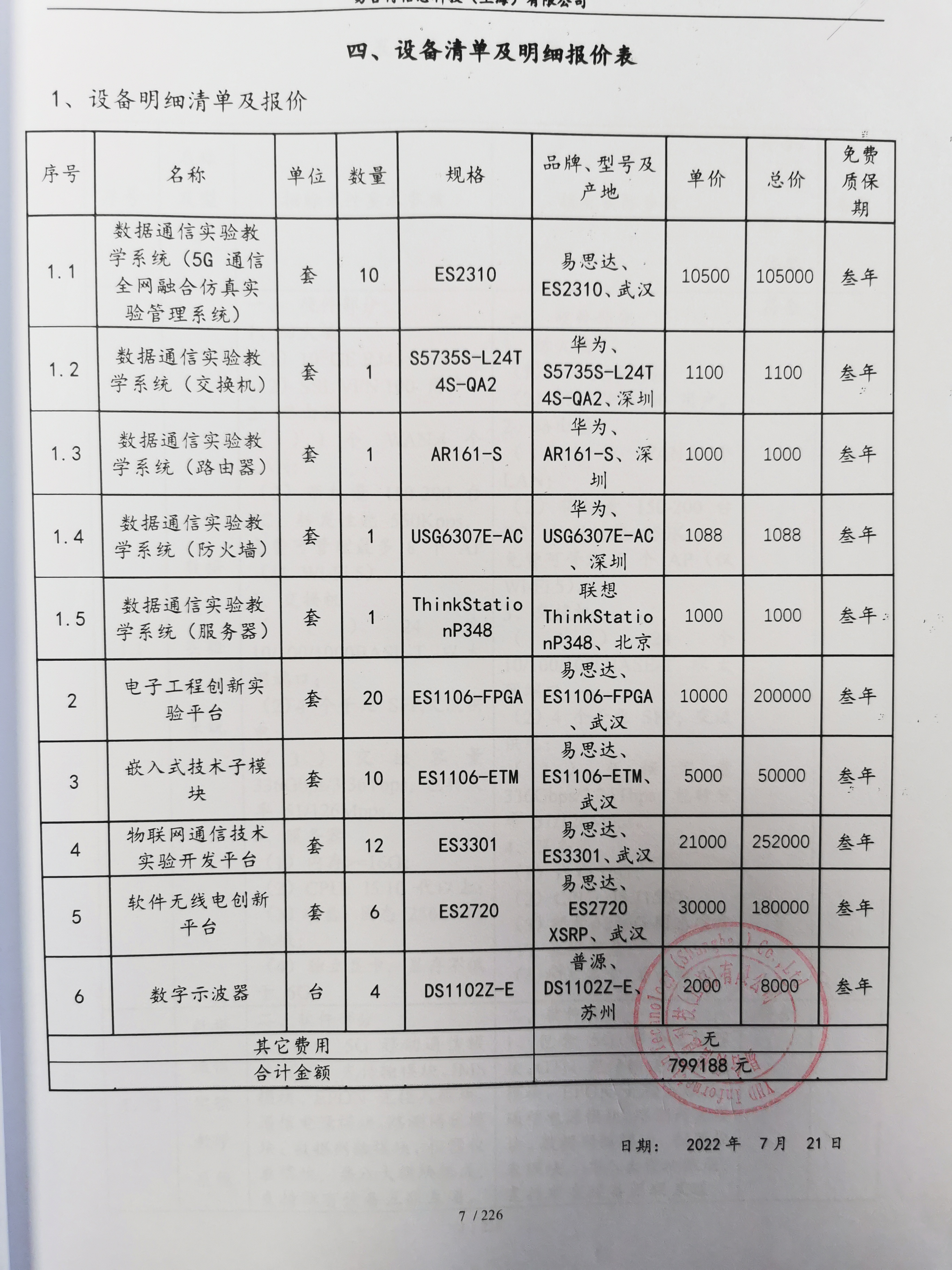 一、项目编号:wz-2022039 二、项目名称: 海洋通信工程专业实验室建设项目 三、中标信息 供应商名称:易合得信息科技(上海)有限公司 供应商地址:上海市静安区广中路805、851号2幢1116室 中标金额:人民币柒拾玖万玖仟壹佰捌拾捌元整(¥799188.00) 四、主要标的信息:见附件产品报价清单 五、评审专家名单:陈通凡(组长) 仲志强 凌霖 李洪梅 王伟然 六、公告期限 自本公告发布之日起1个工作日。 七、其他补充事宜 各有关当事人对采购结果有异议的,可以在应知其权益受到侵害之日起七个工作日内,以书面形式向 招标办提出质疑,逾期将不再受理。 八、凡对本次公告内容提出询问,请按以下方式联系: 1.采购人信息 名 称: 地址:江苏省镇江市梦溪路2号 联系方式:0511-84432622、84400336 2.项目联系方式 项目联系人:招标办赵老师 电 话:0511-84432622、84400336 传真:0511-84432622 九、附件 1、采购文件 2、产品报价清单 |