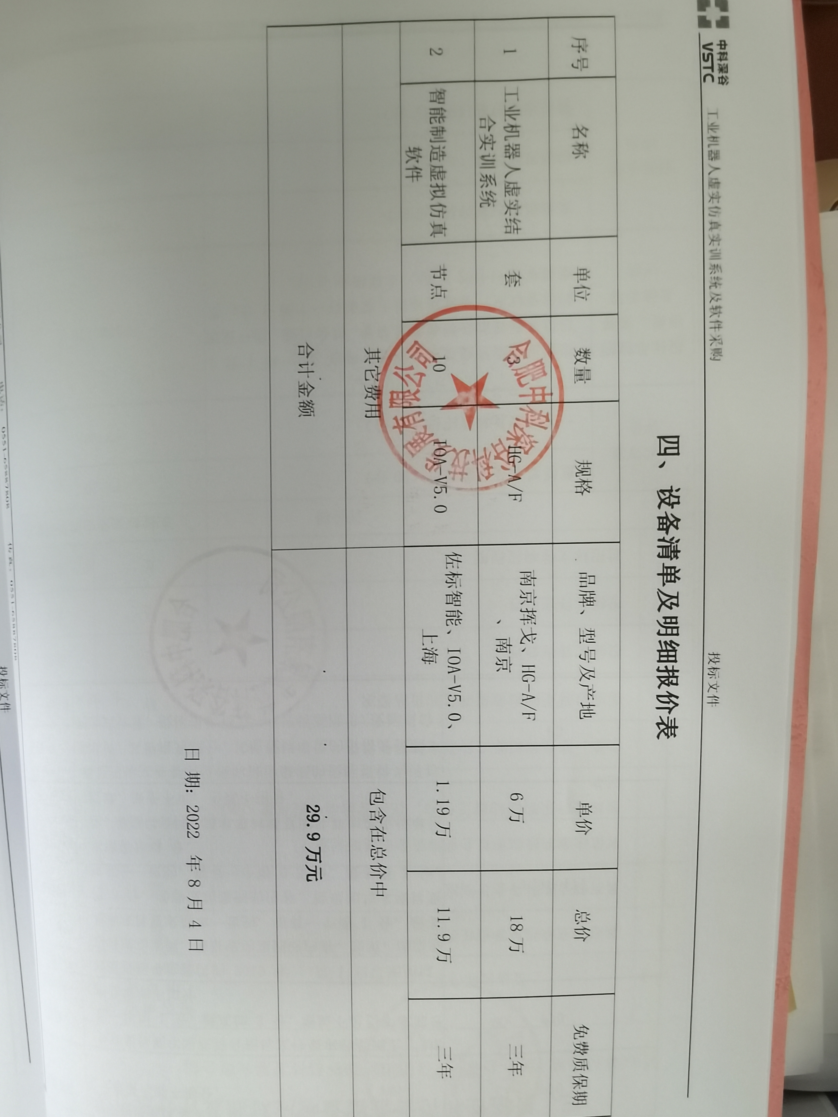 一、项目编号:wz-2022044 二、项目名称:工业机器人虚实仿真实训系统及软件采购 三、中标信息 供应商名称:合肥中科深谷科技发展有限公司 供应商地址:合肥高新区大别山路1800号优思天成产业园7号楼108室 中标金额:人民币贰拾玖万玖仟元整 四、主要标的信息:见附件报价清单 五、评审专家名单: 杭白红 沈妍 卞翔 杜昭平 刘庆华 六、公告期限 自本公告发布之日起1个工作日。 七、其他补充事宜 各有关当事人对采购结果有异议的,可以在应知其权益受到侵害之日起七个工作日内,以书面形式向 招标办提出质疑,逾期将不再受理。 八、凡对本次公告内容提出询问,请按以下方式联系: 1.采购人信息 名 称: 地址:江苏省镇江市梦溪路2号 联系方式:0511-84400336、84432622 2.项目联系方式 项目联系人:苏老师 电 话:0511-84400336、84432622 传真:0511-84432622 九、附件 1.采购文件 2.报价清单