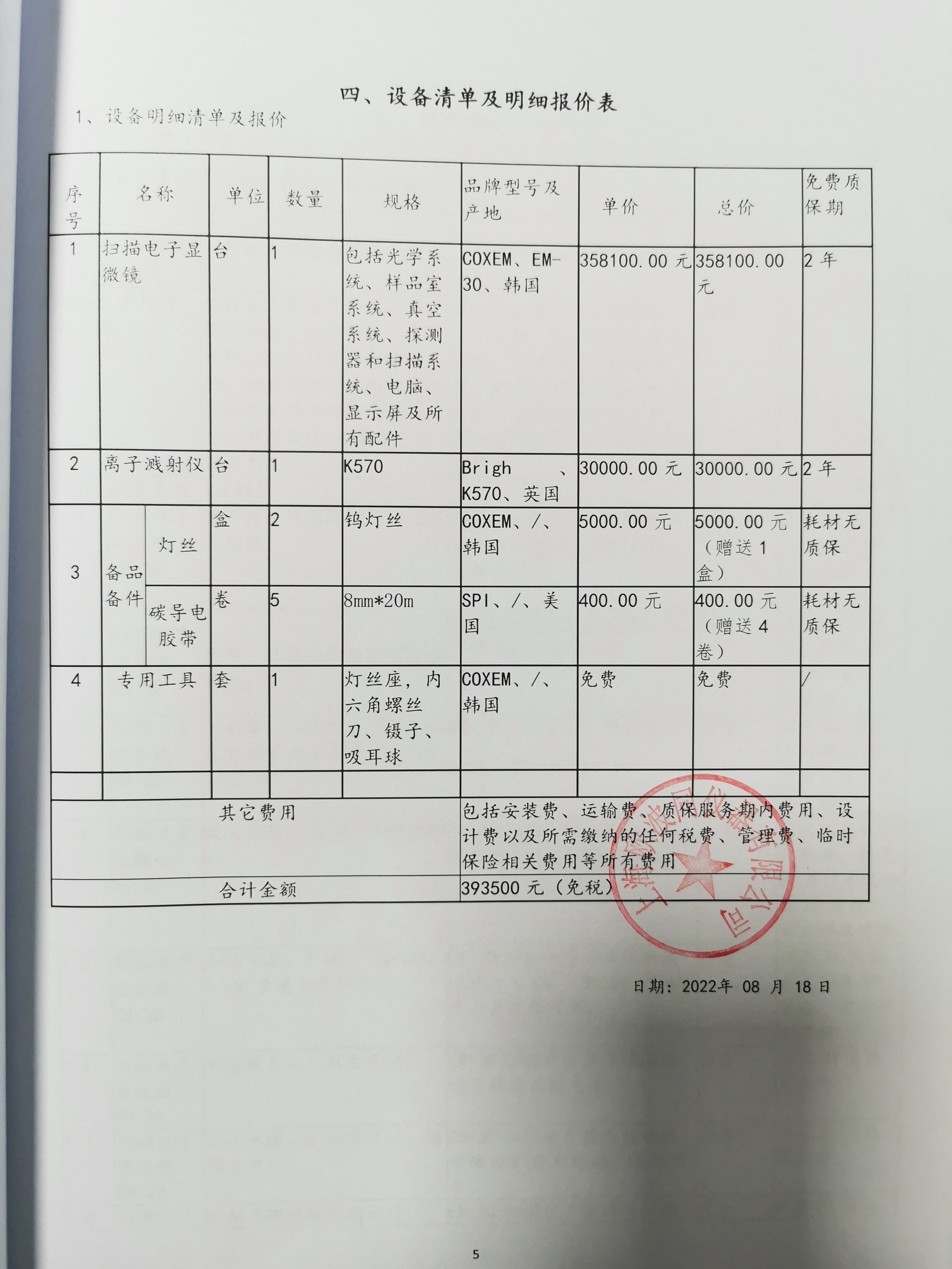 一、项目编号:WZ-2022037 二、项目名称:扫描电子显微镜(进口) 三、中标信息 供应商名称:上海欧波同仪器有限公司 供应商地址:中国(上海)自由贸易试验区临港新片区环湖西二路888号C楼 中标金额:人民币叁拾玖万叁仟伍佰元整(¥393500.00) 四、主要标的信息:见附件报价清单 五、评审专家名单:张超(组长) 杭白红 曹福 陶士强 马继先 六、公告期限 自本公告发布之日起1个工作日。 七、其他补充事宜 各有关当事人对采购结果有异议的,可以在应知其权益受到侵害之日起七个工作日内,以书面形式向 招标办提出质疑,逾期将不再受理。 八、凡对本次公告内容提出询问,请按以下方式联系: 1.采购人信息 名 称: 地址:江苏省镇江市梦溪路2号 联系方式:0511-84432622、84400336 2.项目联系方式 项目联系人:张老师 电 话:0511-84432622、84400336 传真:0511-84432622 九、附件 1.采购文件 2.报价清单 |