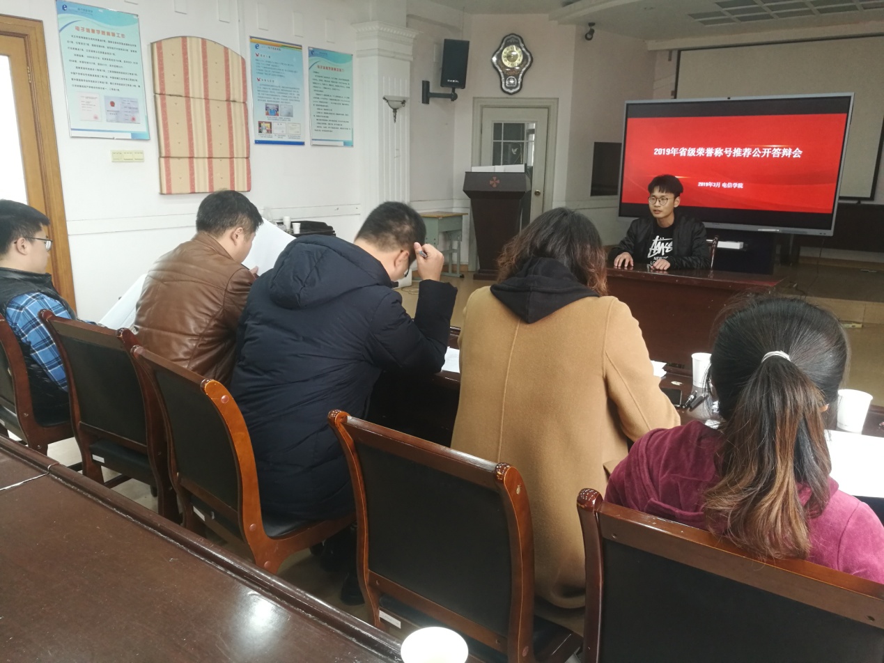 | 为做好2019年省级荣誉称号学院推荐工作,确保公平、公正、公开,3月13日,电信学院组织召开江苏省“三好学生”、“优秀学生干部”、“先进班集体”申请公开答辩会。 本次答辩会评委由5人组成,分别为学院党委副书记何长涛、院团委书记陈天、院教务办主任孙雨、院创新创业办主任朱安宏、学生代表阎鹏宇;辅导员董会担任记录员,辅导员庄媛担任主持人。共18位候选人参加本次答辩会。