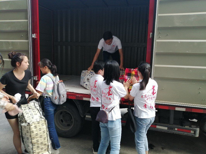 图为志愿者在新校园图书馆卸货