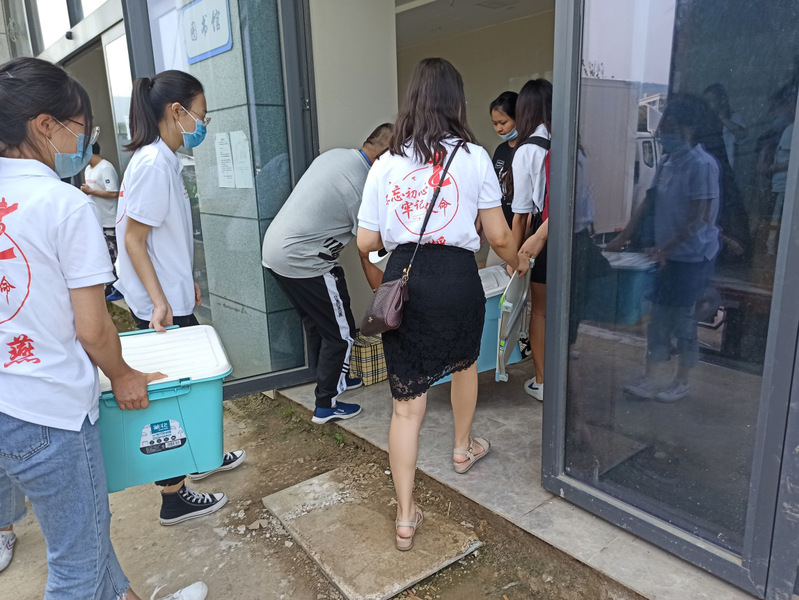 图为志愿者在东校区C5#搬运行李