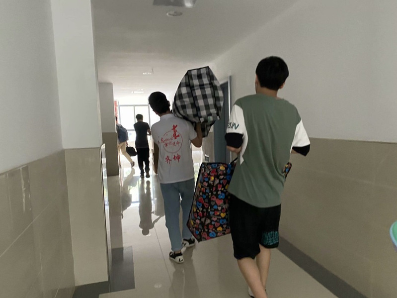 图为志愿者在新校园48#扛行李进宿舍
