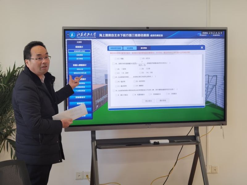 会上,申报课程负责人曾庆军教授现场演示了海上搜救自主水下航行器三维路径跟踪虚拟仿真实验,围绕申报虚拟仿真项目的建设内容、建设方式、项目特色等方面做了汇报,介绍申报课程建设现状,提出下一步课程建设思路和建设措施。