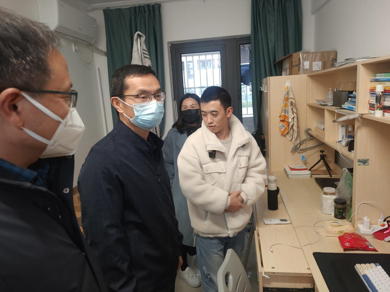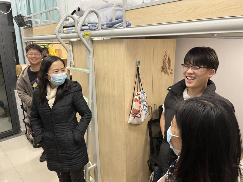 12月07日下午,自动化学院院长姜文刚、党委书记张霞和党委副书记郭峰等老师走进研究生宿舍,和研究生们亲切交流。“你的家乡是哪里?学期末学习怎么样?”姜文刚院长询问同学们个人情况,提醒同学们遵守学校疫情防控规定,自觉做好个人防护,提高安全防范意识,主动规划未来,在兼顾学习的同时也要注重身体健康,不负青春韶华,不负理想岁月。张霞书记鼓励研究生们要充分利用业余时间加强锻炼,保持良好的睡眠,保证身心健康。