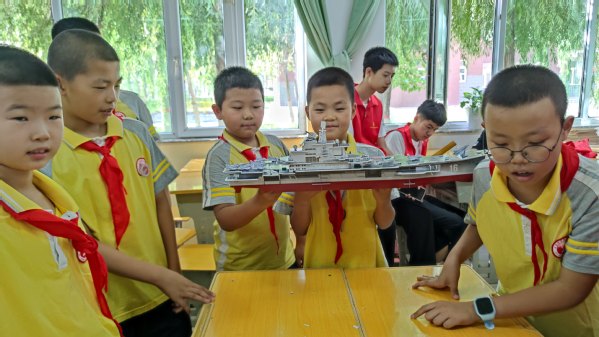 图为学生展示“辽宁号”航空母舰模型拼装结果。张京 供图