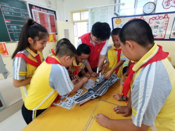 本次活动以嘉兴南湖红船为切入点,巧妙地将党的百年奋斗历程与我国船舶行业发展结合在一起。实践团还特别设计了“辽宁号”航空母舰拼装环节。在实践团成员的指导下,学生们六人一组,将一块块模型零件精心组装,共同构建起他们心中的“海上长城”。